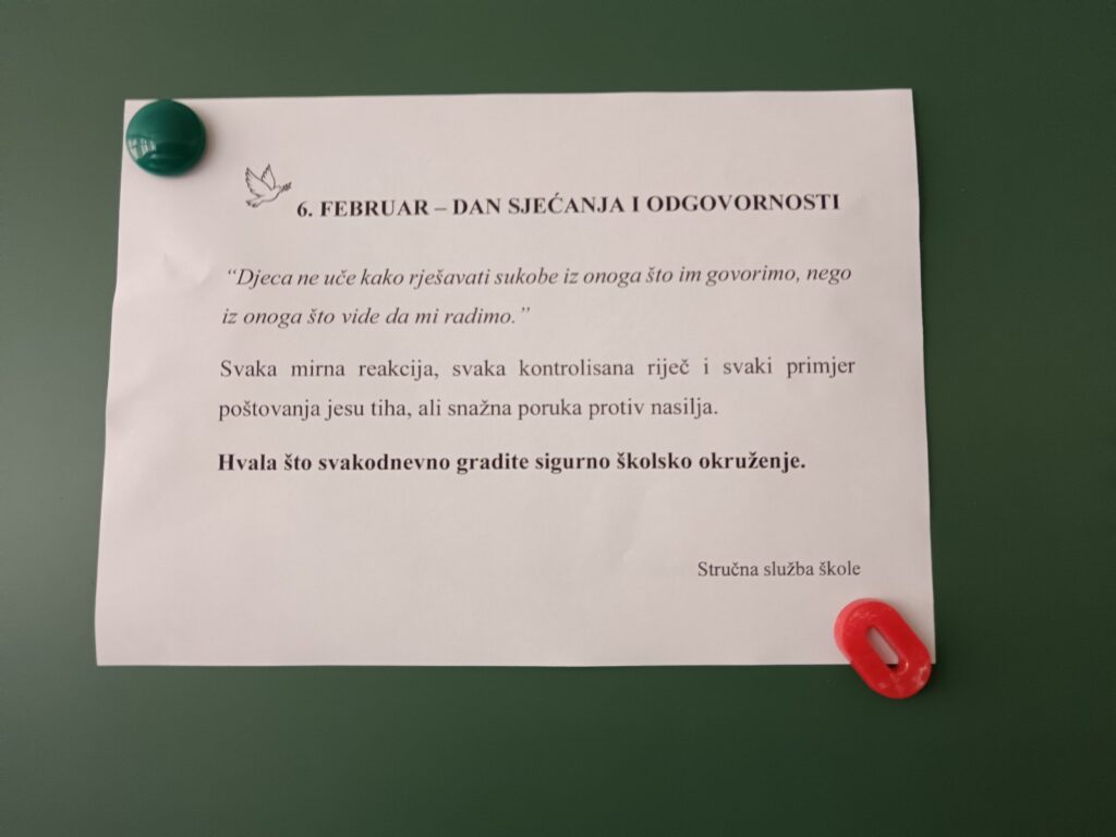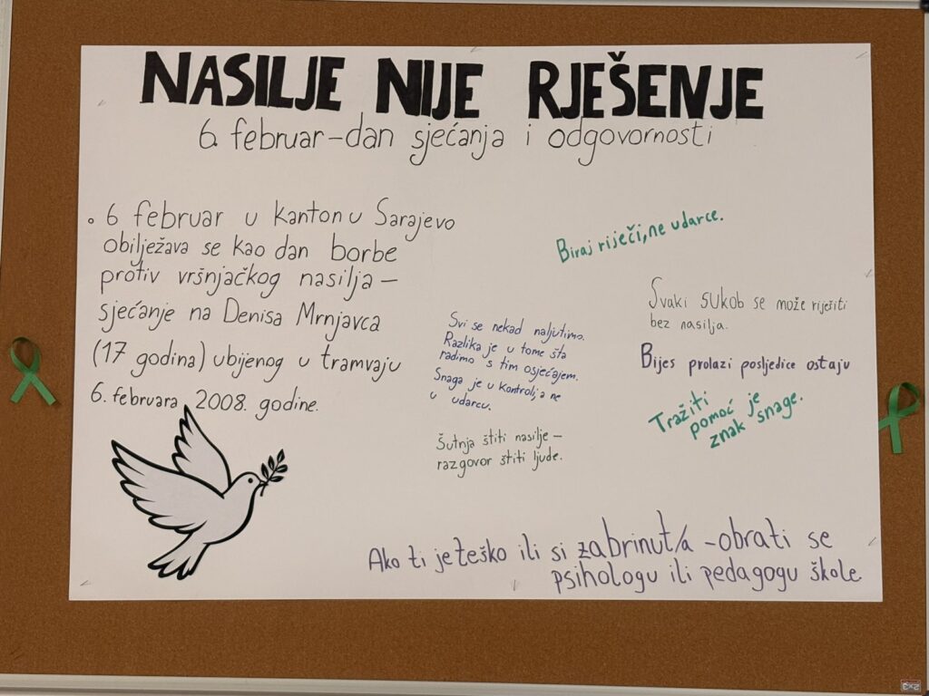Povodom 6. februara, u našoj školi su realizirane aktivnosti usmjerene na prevenciju nasilja i promociju sigurnog školskog okruženja. Tim povodom održane su radionice s učenicima, Vijeće učenika je pripremilo pano s porukama protiv nasilja, a nastavnicima je upućena poruka o važnosti ličnog primjera u izgradnji kulture nenasilja.